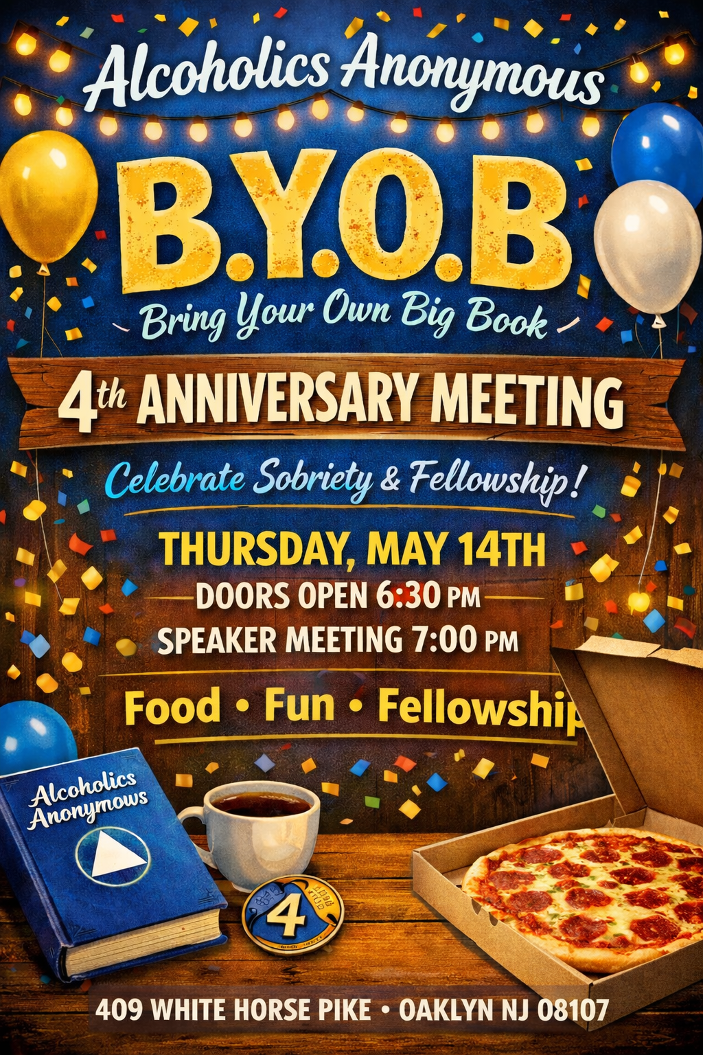 Celebrate sobriety and fellowship at the B.Y.O.B (Bring Your Own Big Book) 4th Anniversary Meeting. Join us for an evening of food, fun, and an inspiring speaker meeting.