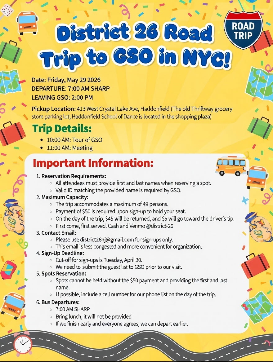 Join District 26 for a fun, organized day trip to NYC with fellowship and connection. Get your seat early β space is limited! π½β¨