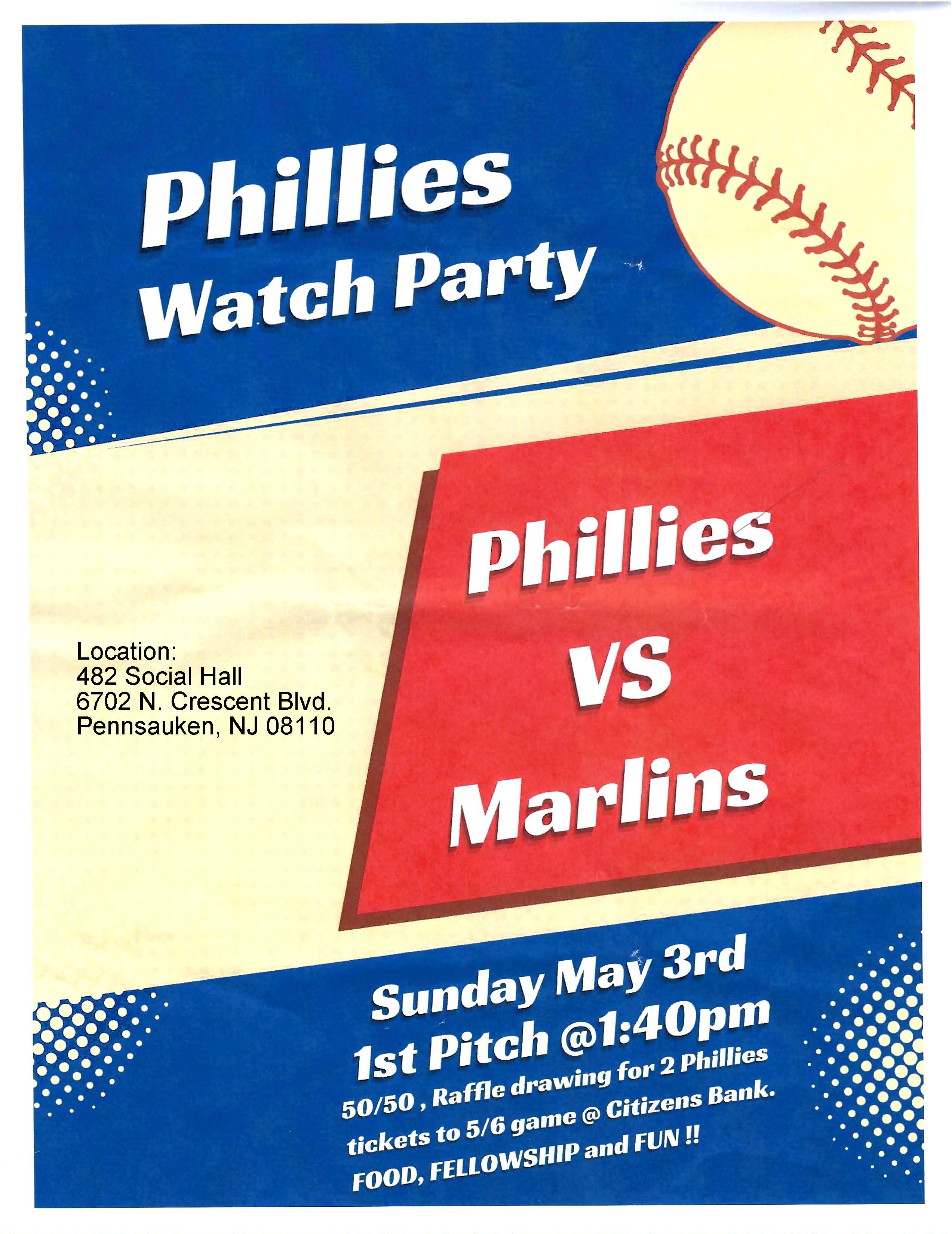 Join us for a fun Phillies Watch Party with food, fellowship, and excitement as the Phillies take on the Marlins. Come enjoy the game together in a lively and welcoming atmosphere.